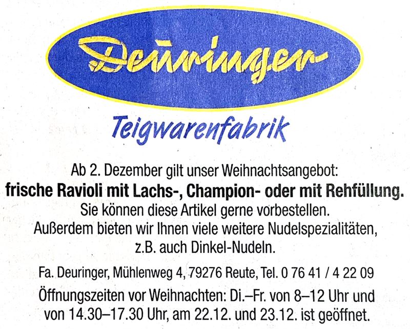 Deuringers Teigwarenfabrik in Reute blickt auf eine über 45jährige Erfahrung zurück. Das bekannte Familienunternehmen fertigt seine Qualitäts-Erzeugnisse nach HACCP-Richtlinien und nur aus den hochwertigsten Rohstoffen.