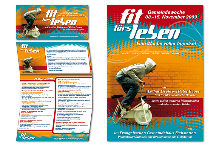 Einlade-Flyer DIN lang, 6-seitig, Wickelfalz und A3-Poster, Gemeindewoche 2009 der Ev. Kirchengemeinde Eichstetten