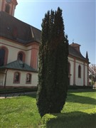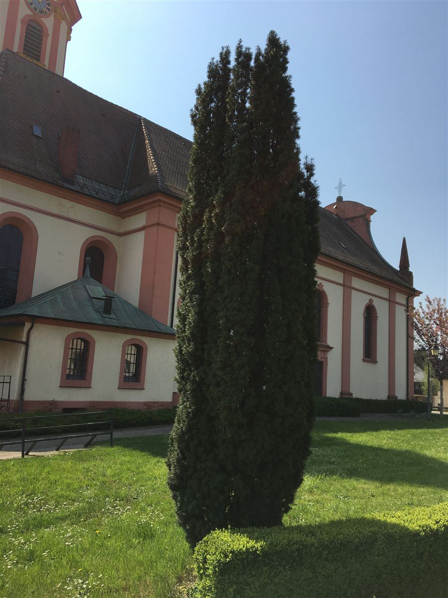 Ein Exemplar der Irischen Säuleneibe (Taxus baccata 'Fastigiata'), auf irisch u.a. Iúr Éireannach genannt, vor der Pfarrkirche St. Michael in Appenweier (Ortenaukreis). Diese klein- und schlankwüchsige Sonderform der Gemeinen Eibe stammt aus Nordirland und wurde im 18. Jahrhundert von einem Bauern an einem Berghang entdeckt.
