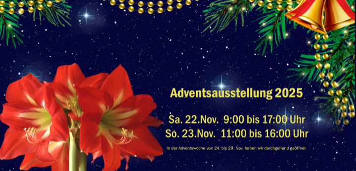 Wir laden Sie herzlich zu unserer stimmungsvollen Adventsausstellung ein. Entdecken Sie weihnachtliche Dekorationen, Gestecke, Lichter und liebevolle Geschenkideen für die besinnliche Zeit – zum Anschauen, Aussuchen und Inspirierenlassen.