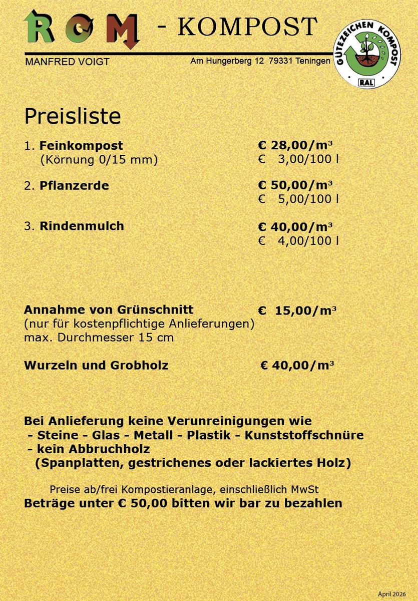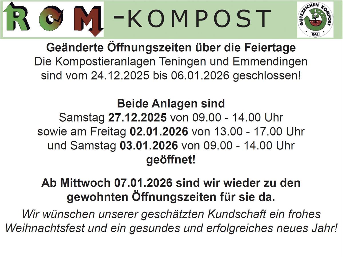 In den Kompostieranlagen ROM-Kompost in Teningen und Emmendingen werden hochwertige, gütegesicherte Komposte erzeugt, die als Baustoffe zur Bodenverbesserung bzw. als Düngemittel im Hobbygarten, im Landschafts- und Gartenbau sowie in der heimischen Landwirtschaft verwendet werden.